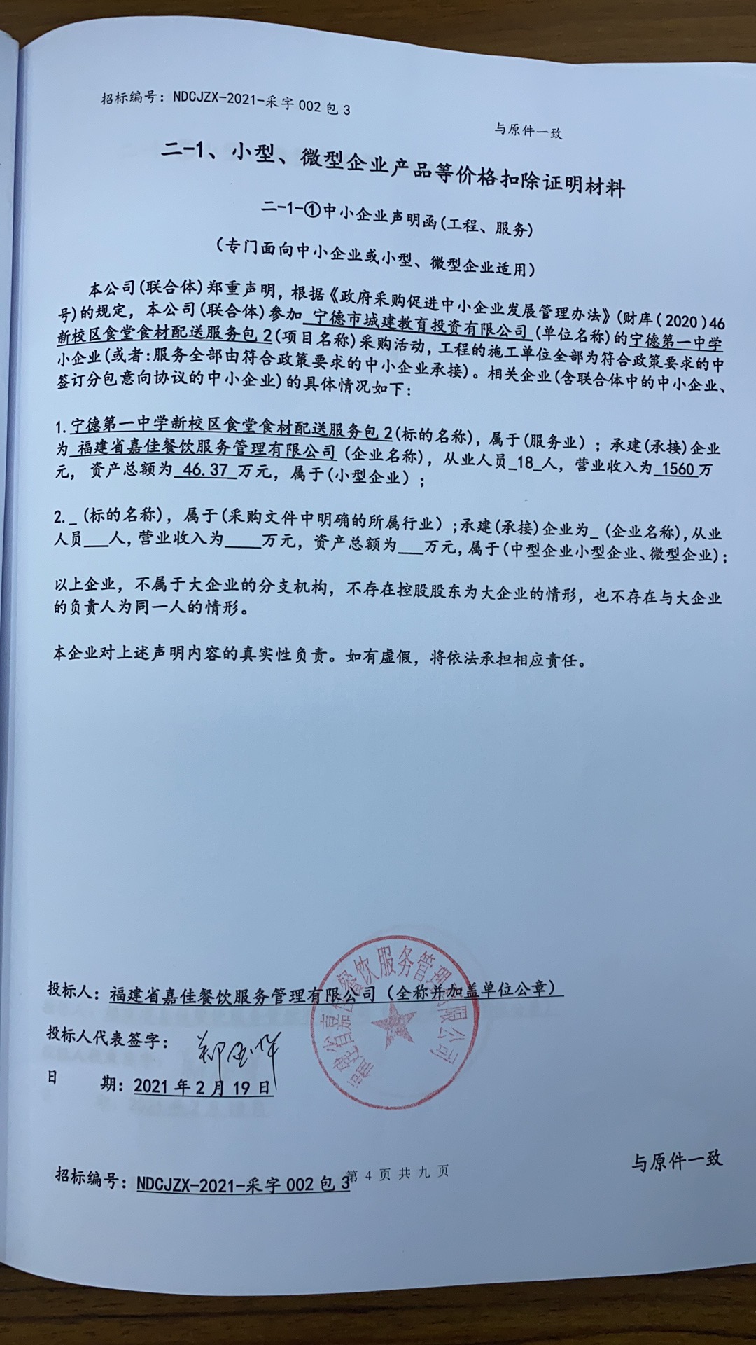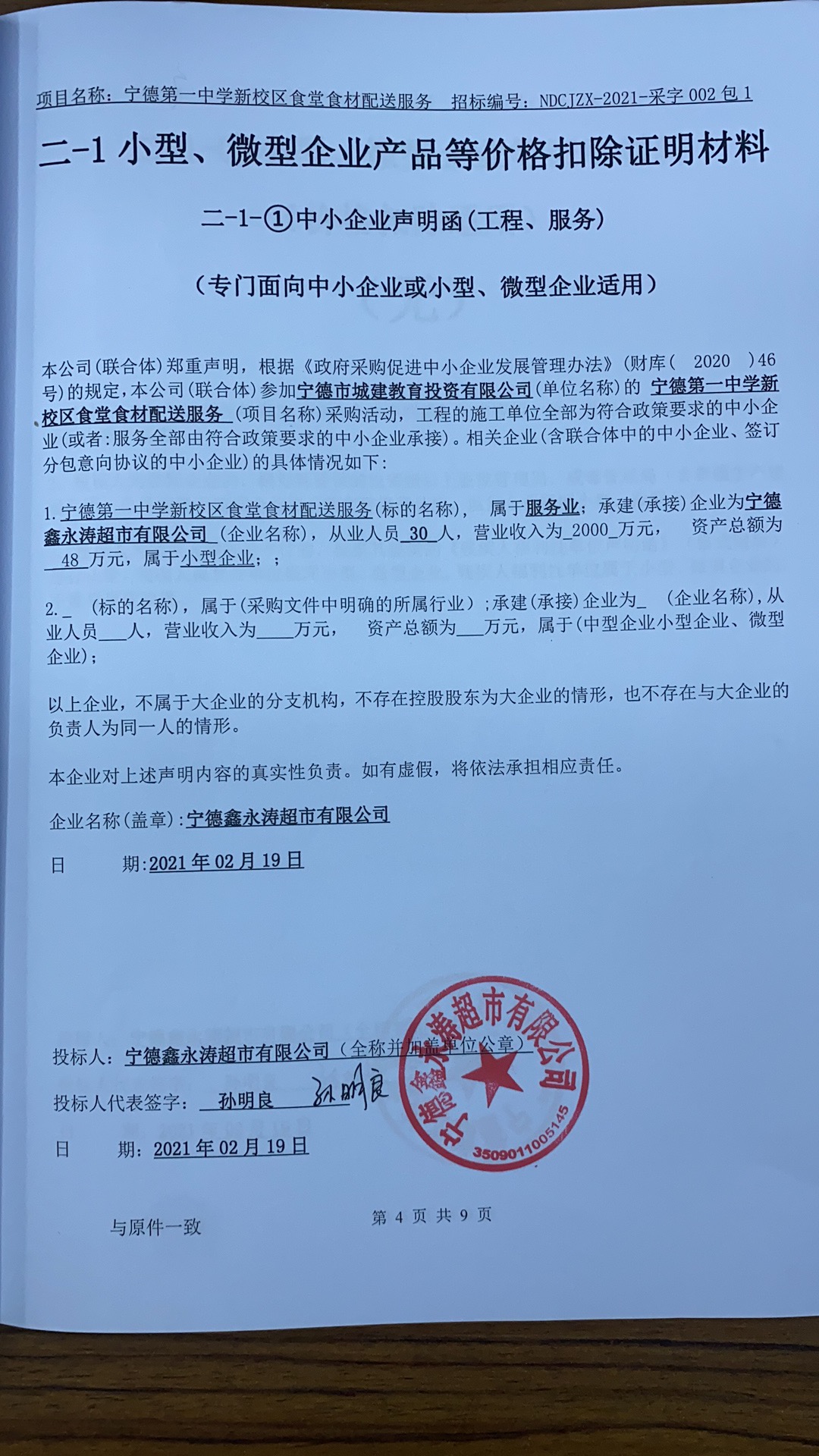 1 | 寧德鑫永濤超市有限公司 | 寧德第一中學新校區(qū)食堂食材配送服務 | 寧德第一中學新校區(qū)食堂食材配送服務合同包1主、副食品 | 投標人須根據實際情況安排固定車輛(至少1輛可隨時調派的車輛)和1名固定司機、1名送貨人員負責送貨上門等,具體詳中標人的投標文件。 | 供應合同期(服務期限)為兩年(法定工作日),本項目合同一年一簽,采購人有權對中標人的前一年度的服務進行考核并覺得是否續(xù)簽合同,具體起止時間以合同簽定為準。 | 中標人所提供產品必須符合“中華人民共和國食品安全法”要求等,具體詳中標人的投標文件。 |